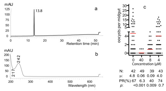 The characteristic profiles of the pure active compound. (a) HPLC profile showed one peak. (b) UV-Vis absorbance profile. (c) The pure compound inhibited P. falciparum transmission to An. gambiae in a dose-dependent manner. N: # of mosquitoes for each treatment; μ: the mean oocysts in a midgut; PR: infection prevalence in mosquitoes; p: statistical values compared to the control (no compound) by Wilcoxon test.