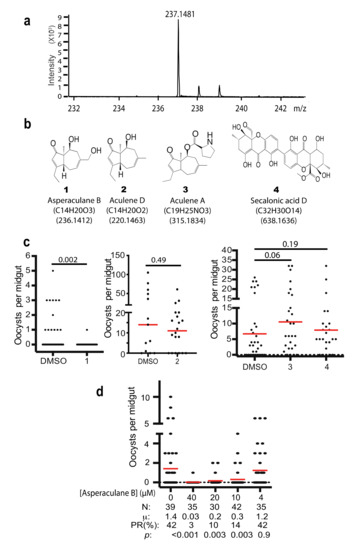 Identification of the active compound. (a) The high-resolution mass spectrometry of the HPLC purified compound with a proton (236.1403 + 1.0078 = 237.1481). (b) Four purified and identified compounds from A. aculeatus from other research labs [12,14]. (c) The transmission-blocking activities of four compounds. (d) The transmission-blocking activity of serial dilution of asperaculane B. N: # of mosquitoes for each treatment; μ: the mean oocysts per midgut; PR: infection prevalence in mosquitoes; p: The statistical p values of each concentration comparing to the control (concentration was 0).