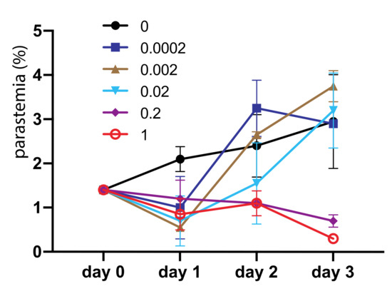 We also determined the inhibition efficacy of asperaculane B on asexual stage Plasmodium development. One µL asperaculane B in DMSO with different concentrations was added into 150 µL P. falciparum culture, and the parasitemia was monitored in the following three days. During this process, we replaced the medium on day two, and added the same amount of asperaculane B. Results (Figure 7) show that at low concentrations, e.g., <0.02 μg/mL, the inhibition is not significant. However, the average parasitemia in replicates at 0.2 μg/mL and 1 μg/mL asperaculane B concentration was 0.7% and 0.3% on day 3 respectively, about 30% and 10% of control, respectively. Collectively, these data indicate that asperaculane B can also inhibit asexual stage parasite development in blood. The IC50 on day three was 0.72 μg/mL or 3 μM.