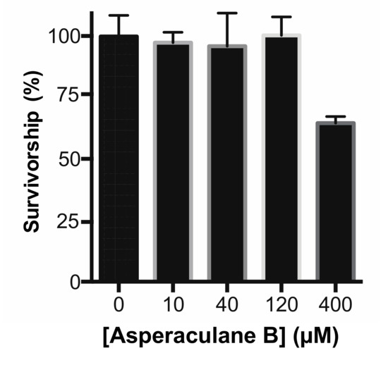 Finally, we analyzed the cytotoxicity of asperaculane B as an initial step to understand its molecular mechanism and develop a drug. Asperaculane B was added into human embryonic kidney 293 (HEK293) cell culture. After incubation for 24 h, MTT (3-(4,5-dimethylthiazol-2-yl)-2,5-diphenyltetrazolium bromide) assay showed no significant cytotoxic effects of this compound at the concentrations of ≤120 μM (Figure 8). A substantial reduction in cellular growth was detected only when the level increased to 400 μM. Notably, the 40 μM compound was able to inhibit malaria transmission in mosquitoes completely.
