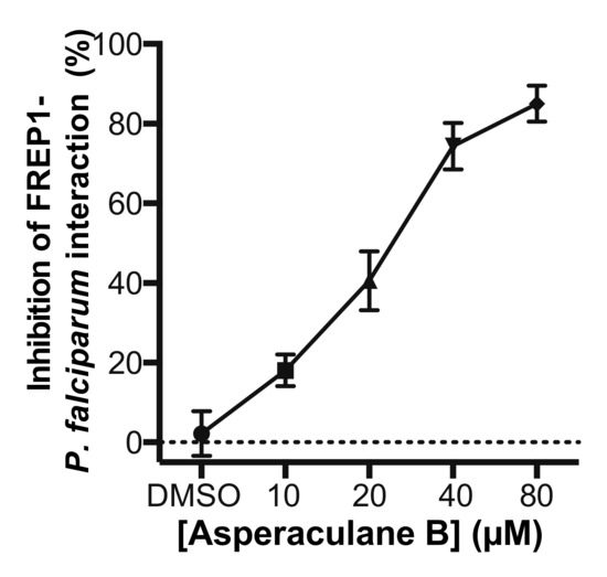 Since the candidate fungal extract was obtained by screening the GFEL for their inhibition on FREP1-falciparum interaction, we determined whether asperaculane B could prevent FREP1 from binding to P. falciparum-infected cell lysate. Microplates were coated with P. falciparum- infected cell lysates. Then asperaculane B was mixed with FREP1 protein to make final concentrations of 10, 20, 40, and 80 μM, which were loaded to the microplate. The DMSO (1%, v/v) was a non-inhibition control. The results showed that asperaculane B significantly inhibited the interaction between FREP1 protein and P. falciparum-infected cell lysate, and the inhibition was also dose-dependent (Figure 9).