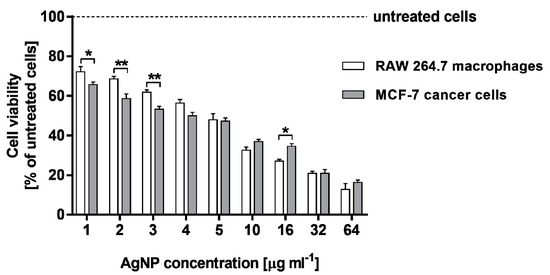 For the determinationof the level of cell viability, the MTT assay was performed. This test detects the reduction of MTT (3-(4,5-dimethylthiazolyl)-2,5-diphenyl-tetrazolium bromide; Sigma Aldrich) by mitochondrial dehydrogenase to blue formazan product, which reflects the normal functioning of mitochondria, and hence, the metabolic rate of cells. For each experiment, 1 × 104 MCF-7 cells, as well as RAW 264.7 macrophages, were seeded in 96-well tissue culture plates in 200 µL of suitable complete culture medium. The plates were incubated at 37 °C in 5% CO2 for 24 h to allow cell adhesion, prior to the silver nanoparticle testing. Then, the different concentration (1, 2, 3, 4, 5, 10, 16, 32 and 64 µg·mL−1) of AgNPs in the corresponding cell culture medium (RPMI 1640 medium for MCF-7 cells or DMEM medium for RAW 264.7 macrophages, respectively) was added to the culture. Blank wells (without cells) contained a specific concentration of AgNPs in the appropriate culture medium. The plates were incubated for 24 h under the same conditions. After treatment, the cells were washed with phosphate-buffered and 100 µL per well of MTT/culture medium (without phenol red) solution (5 mg·mL−1 of MTT reagent in PBS; RPMI 1640 medium for MCF-7 cells and DMEM medium for RAW 264.7 cells) was then added to each well. Culture plates were incubated at 37 °C for 4 h. Subsequently, the MTT/culture medium solution was removed, and the formazan product formed by viable cells was dissolved in 100% DMSO (100 µL per well). The plate was mixed horizontally for 10 min and the optical density was measured at 570 nm (with a reference wavelength of 630 nm) using a Synergy HT Multi-Mode Microplate Reader (BioTek Instruments, Winooski, VT, USA). The results were expressed as the percentage of untreated cells, which was served as 100%. The percentage of cell viability was computed according to the following formula: