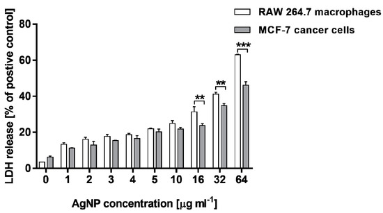 The LDH release assay supported the results of the MTT test. As compared with the positive control, cells treated with 0.8% Triton X-100 solution for 45 min and AgNP-stimulated RAW 264.7 macrophages, as well as MCF-7 cells, exhibited an increase in LDH leakage in a dose-dependent manner. The cytotoxicity measured for RAW 264.7 cells was from 13.3 ± 0.9% to 62.9 ± 0.3%, whereas that estimated for MCF-7 was in a range of 11.2 ± 0.2%–46.1 ± 2.0%. Moreover, RAW 264.7 cells treated with the highest concentrations of AgNPs (16, 32 and 64 µg·mL−1) released greater amounts of LDH in comparison with MCF-7 cells (Figure 5). The amounts of LDH measured in culture media from untreated control cells were 3.5 ± 0.4% and 6.2 ± 0.6% for RAW 264.7 and MCF-7 cells, respectively. All the tested AgNP concentrations increased LDH leakage compared with untreated cells (p < 0.001).