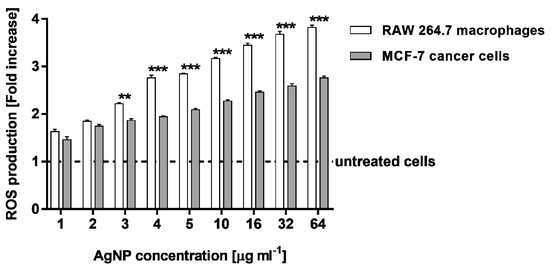 ROS (reactive oxygen species) production level in MCF-7 human breast cancer cells and murine macrophage cells RAW 264.7, after treatment with various concentrations of biosynthesized AgNPs. Asterisks indicate significant differences between the ROS production in RAW 264.7 macrophages in comparison with MCF-7 cancer cells (*** p < 0.001; ** p < 0.01).