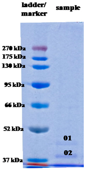 The electrophoresis under denaturing conditions (SDS-PAGE) was performed using 10% (w/v) running gel and 4% (w/v) stacking gel, according to the method described by Ogita and Markert [73]. The samples containing 20 µg of protein were applied into the wells of the polyacrylamide gel. The separation was be carried out at 150 V, until the dye reached the end of the separating gel. After electrophoresis, the gel was stained using a Coomassie Brilliant Blue R-250 [74].