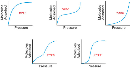 The International Union of Pure and Applied Chemistry (IUPAC) recognizes six types of isotherms; however, according to the classification of Brunauer, Emett and Teller [22], adsorption processes can be classified into five (Figure 1). In chemisorption cases, only type I isotherms are present, while in physisorption, all five cases occur.