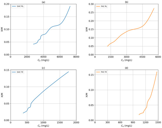 Experimental isotherms: granular activated carbon with raw leachate (GAC RL) (a), powdered activated carbon with raw leachate (PAC RL) (b), granular activated carbon with Fenton effluent (GAC FE) (c) and powdered activated carbon with Fenton effluent (PAC FE) (d).