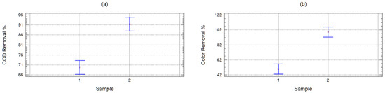 Mean charts of the chemical oxygen demand (COD) (a)) and color (b) removal efficiency, according to the type of sample (1 = RL and 2 = FE).