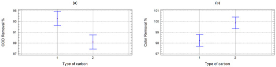 When observing that the samples are different, it was decided to remove this variable from the analyses of variance. It was proceeded to continue analyzing only the results of the FE samples. According to the p-values (less than 0.05) obtained from the analysis of variance, both variables (carbon and quantity) turned out to be significant, and according to Figure 4, the carbon with which the best COD removals are obtained is with the GAC, while with the PAC, the color is removed more efficiently. This is for the characteristics of the carbons, since their pore size is different (macroporous GAC and mesoporous PAC) and have a different surface area, being greater in the mesoporous. Therefore, with this carbon, the larger molecules are better removed that have remained after intensive oxidation; however, it lets through those tiny ones that continue to confer the organic load to the effluent (humic substances).