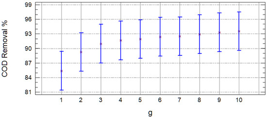Figure 5 shows that, from the 2 g of carbon added, all the treatments are statistically the same; however, lower doses (1 g) offer lower COD removals. The adsorption power of GAC is for its high porosity and thermostability characteristics [36]. In general, activated carbon can remove recalcitrant compounds from leachates—both organic and inorganic—turbidity and color [38].