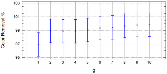 In the analysis of variance of the color removal, with respect to the amount of carbon, a p-value equal to 0.999 is obtained, which indicates that all the amounts of carbon result in a statistically equal % removal of color. This can be observed in Figure 6. Kulikowska et al. 2016 [38] mention that large doses of PAC could be less efficient due to the high consumption of carbon related to a slight increase in efficiency.
