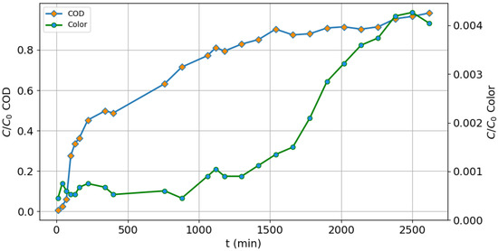 However, for the retention of the molecules that give color to leachate, the carbon was able to maintain a C/C0 < 0.005 until the end of the test, as observed in Figure 7. This is because, during Fenton oxidation, the dissolved solids in the leachate were degraded, so the size of these particles is much smaller than the original (of the crude leachate), and they are more easily adsorbed in the interstices of the carbon.