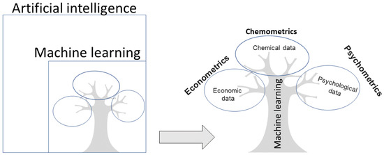 Artificial intelligence research involves building computer programs designed to behave or mimic human brain functions such as talking, playing soccer, and planning. Within the field of artificial intelligence, a very widespread area known as machine learning has developed, which involves the applications of different algorithms that are able to learn and improve from experience. Machine learning is divided into two types: supervised and unsupervised [9]. In supervised learning, the goal is to predict the value of an output variable based on several input variables; in unsupervised learning, the goal is to describe the associations and patterns among a set of input variables without an output variable. Machine learning methods for data evaluation and interpretation can be used in many fields, and often have different names depending on the area of study. For example, when applying machine learning in psychology, the discipline is called psychometrics [10,11], in economics, econometrics [12], and in chemistry, chemometrics [13] (Figure 1).