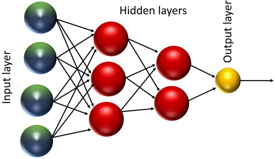 An artificial neural network (ANN) is a non-linear computational model attempting to simulate human brain structure and decision making [14]. There are many types of neural network, such as the convolutional neural network (CNN), recursive neural network (RNN), and feed forward neural network (FFNN). The simplest form of ANNs is the FFNN, which consists of one or more hidden layers of perceptrons (neurons) (Figure 2) [15]. Each perceptron has an activation function which computes an output signal depending on the weighted input received. Perceptrons from one layer are connected to perceptrons in the next layer and the output signal flows from one layer to the next without any feedback connections [16,17]. The connection between the perceptrons is characterized by different variables. These are a weight and bias values associated with each node as well as the transfer function that determines the state of a node based on the weight and bias parameters [18]. FFNN requires supervised training by taking input of example data sets and desired output results that are fed to the network multiple times. Each time the weights of the activation function are adjusted so that the error in the output is minimized.