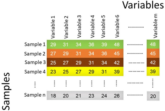 Non-linear models can be built from simple multi-element analysis such as chromatography, spectroscopy, mass spectrometry, thermal analysis, electrochemical analysis, microscopic and diffraction scattering techniques to study food analysis. These data are represented as a matrix consisting of rows and columns, where the rows represent samples and the columns represent variables (Figure 5).