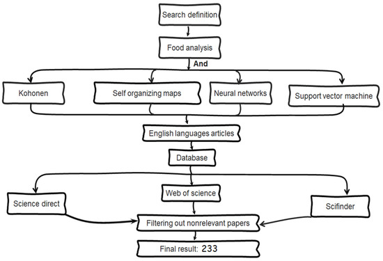 References used for this review were obtained by in-depth search of three distinct online accessible databases: Science Direct, SciFinder, and Web of Science. Although each database engine has a different interface for performing corresponding searches, the main search term “food analysis” was used in combination with terms for different types of machine learning techniques; namely, “Kohonen”, “self-organizing maps”, “neural networks”, and “support vector machine”. Research papers that did not relate to our search topic were discarded as well as papers not written in English. Review papers were also discarded order to avoid circular referencing. These criteria produced a list of a total of 233 references used for this review (Figure 6).