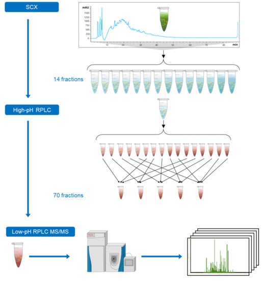 - Yang, F.; Shen, Y.; Camp, D.G.; Smith, R.D. High-pH reversed-phase chromatography with fraction concatenation for 2D proteomic analysis. Expert Rev. Proteomics 2012, 9, 129–134. [Google Scholar] [CrossRef] [PubMed]