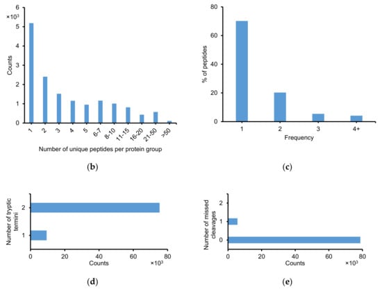 Summary of the results from proteomic profiling of E. huxleyi using 3D-LC system. (a) The accumulated numbers of identified peptides and protein groups (single hit included) versus the number of fractions. (b) Number of unique peptides per protein group. (c) Distribution of peptides by frequencies in 70 fractions. (d) Number of tryptic termini in identified peptides. (e) Number of missed cleavages in identified peptides.