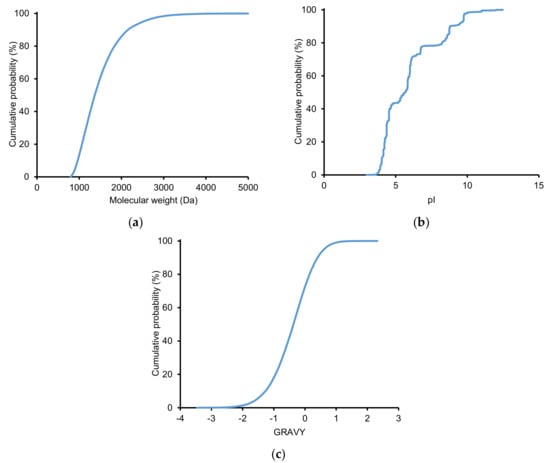 Cumulative distribution of (a) molecular weight, (b) isoelectric point (pI), and (c) the grand average of hydropathy (GRAVY) value of identified peptides. GRAVY values of peptides were calculated using the GRAVY calculator (http://gravy-calculator.de/); negative GRAVY values signify hydrophilicity, and positive values indicate hydrophobicity.