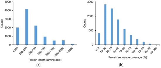 Distribution of identified proteins groups according to (a) protein length and (b) protein sequence coverage.