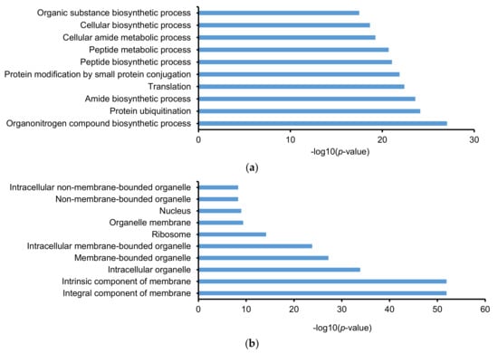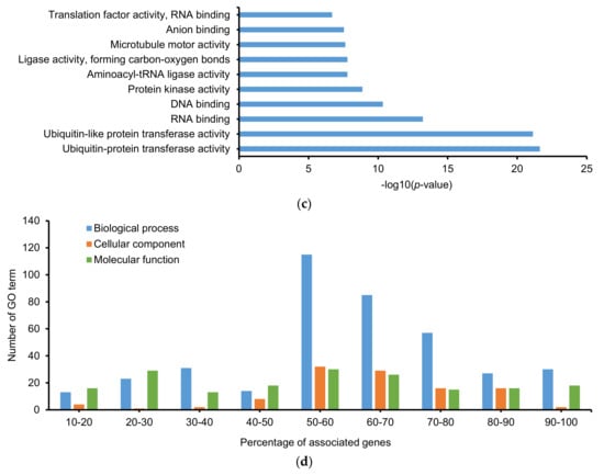 ClueGO add-in (Cytoscape) was used to categorize the identified proteins/protein groups based on GO and KEGG pathways. The database of E. huxleyi contained 2802 biological processes (9885 genes), 509 cellular components (8596 genes), 1452 molecular functions (12,470 genes), and 104 KEGG pathways (3259 genes), which was updated on 31 October, 2019. In total, 1454 biological processes (51.9%), 235 cellular components (46.2%), 678 molecular functions (46.7%), and 100 KEGG pathways (96.2%) were found. After filtering with a p-value of ≤0.05, 15 KEGG pathways were defined and listed in Table 1. The percentages of associated genes vary from 21.1 to 83.9%. Some KEGG pathways were identified with high percentages of associated genes, such as basal transcription factors, citrate cycle (TCA cycle), proteasome, spliceosome, mRNA surveillance pathway, protein processing in endoplasmic reticulum, and amino sugar and nucleotide sugar metabolism (≥67%). In addition, after filtering with a p-value of ≤0.05, the identified protein groups are involved in 395 biological processes, 110 cellular components, and 181 molecular functions (Table S3). Top 10 GO terms with highest −log10(p-value) were presented in Figure 5a–c. The top 10 biological processes are biosynthetic processes, metabolic processes, translation, protein modification, and protein ubiquitination. The top 10 cellular components are components of membrane, nucleus, ribosome, and different organelles. The top 10 molecular functions are transferase, ligase, and kinase activity, and different binding functions. Figure 5d classifies GO terms regarding the percentage of associated genes. It is evident that most of the GO terms have 50 to 80% associated genes.