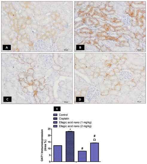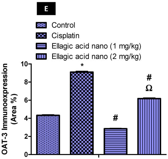 Impact of ellagic acid nanoformulation on kidney OAT3 immunoexpression examined in cisplatin-treated rats. (A) Control group; (B) cisplatin group; (C) ellagic acid nano (1 mg/kg); and (D) ellagic acid nano (mg/kg). (E) Bar chart showing OAT3 immunoexpression (area %) in the different experimental groups. Results were presented as mean ± SE (n = 6). * p ≤ 0.05 relative to the control group; # p ≤ 0.05 relative to cisplatin group; Ω p ≤ 0.05 relative to ellagic acid nano (1 mg/kg) group.