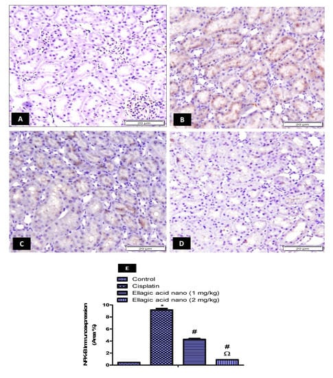 Impact of ellagic acid nanoformulation on kidney nuclear factor kappa-beta (NFK-B) immunoexpression examined in cisplatin-treated rats. (A) Control group; (B) cisplatin group; (C) ellagic acid nano (1 mg/kg); and (D) ellagic acid nano (2 mg/kg). (E) Bar chart showing NFK-B immunoexpression (area %) in the different experimental groups. Results were presented as mean ± SE (n = 6). * p ≤ 0.05 relative to the control group; # p ≤ 0.05 relative to cisplatin group; Ω p ≤ 0.05 relative to ellagic acid nano (1 mg/kg) group.
