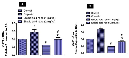 Real-time PCR analysis of (A) OAT1 mRNA, and (B) OAT3 mRNA expression in kidney tissues of expression levels were normalized to the reference gene B2m using the comparative Ct method (2−∆∆ Ct). Results were presented as mean ± SE (n = 6). * p ≤ 0.05 relative to the control group; # p ≤ 0.05 relative to cisplatin group; Ω p ≤ 0.05 relative to ellagic acid nano (1 mg/kg) group.