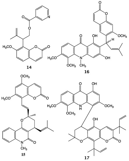 - Takemura, Y.; Kurozumi, T.; Ju-ichi, M.; Okano, M.; Fukamiya, N.; Ito, C.; Ono, T.; Furukawa, H. The structures of Neoacrimarines-C and -D, two new acridone-coumarin dimers from Citrus hassaku. Chem. Pharm. Bull. 1993, 41, 1757–1759. [Google Scholar] [CrossRef][Green Version]