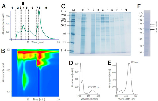 (A) The chromatogram at 280 nm and (B) HPLC absorbance spectrum from pectenovarin purification using a photodiode array detector (PDA). (C) SDS-PAGE of the HPLC fractions. M: size marker; C: the crude extract of the scallop ovary; 1–9: the fraction numbers corresponding to Figure 1A. (D) Absorbance spectrum of pectenovarin at TR = 8.459 min and (E) pectenolone in acetonitrile/methanol/water at 50:50:1. The peak maxima of the carotenoid chromophore of pectenovarin are at 479 and 503 nm, while that of pectenolone is at 463 nm. (F) The ladder-like bands originally appeared and gradually converged at 95 kDa (band 4) after several freeze-thaw processes.