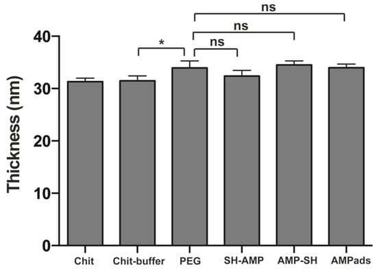 Thickness of the unmodified chitosan films, chitosan (Chit) and chitosan exposed to reaction buffer (Chit-buffer); chitosan films modified with succinimidyl-[(N-maleimidopropionamido)-octaethyleneglycol] ester (SM(PEG)8) (PEG); chitosan films modified with AMP (SH-AMP/AMP-SH), and adsorption control (AMPads), according to ellipsometry measurements. Statistically significant differences at p < 0.05 are indicated with *; ns, not significant.