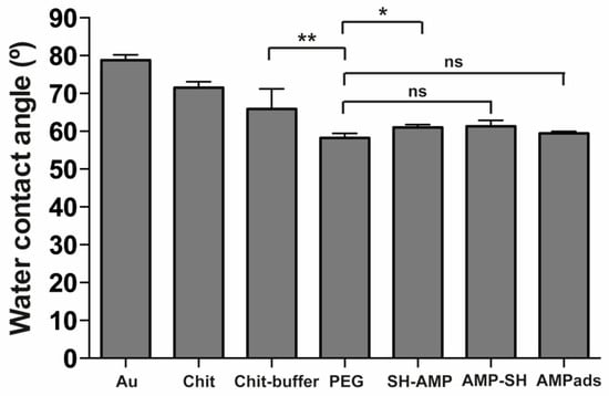 Wettability of the unmodified chitosan films, chitosan (Chit) and chitosan exposed to reaction buffer (Chit-buffer); chitosan films modified with succinimidyl-[(N-maleimidopropionamido)-octaethyleneglycol] ester (SM(PEG)8) (PEG); chitosan films modified with AMP (SH-AMP/AMP-SH), and adsorption control (AMPads), according to contact angle measurements. Statistically significant differences are indicated as * p < 0.05, ** p < 0.01; ns, not significant.