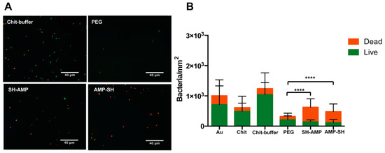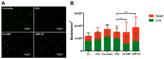 Antimicrobial activity of MSI-78(4-20)–chitosan films. (A) Representative images of chitosan films labeled with LIVE/DEAD™ BacLight ™ Bacterial Viability Kit (Thermo Fisher Scientific, Waltham, Massachusetts), after contact with S. epidermidis. Images were collected using an inverted fluorescence microscope with 400× magnification. (B) Quantification of the viability of adherent bacteria. Statistically significant differences are indicated as * p < 0.05, *** p < 0.001 (non-parametric Kruskal–Wallis test of dead group). Gold substrate (Au); unmodified chitosan films, chitosan (Chit) and chitosan exposed to reaction buffer (Chit-buffer); chitosan films modified with succinimidyl-[(N-maleimidopropionamido)-octaethyleneglycol] ester (SM(PEG)8) (PEG); chitosan films modified with AMP (SH-AMP /AMP-SH).