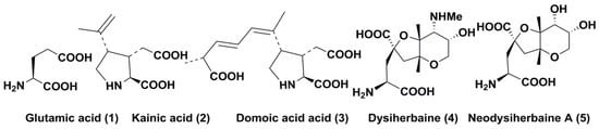 MEAAs, including the main compounds shown in Figure 1, are a chemical group of particular research interest to us, although many of them were discovered long ago. This is explained by our studies on highly polar marine metabolites from northwestern Pacific invertebrates, including sponges, and marine bacteria and search for new excitatory compounds or their analogs. Another explanation is the long-term interest of one of the coauthors of the present review (S.I.) [5] in domoic acid (DA), and in DA-producers from the northern Pacific Ocean.