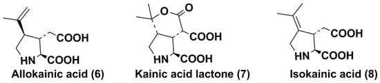 The key member of the kainoid family, kainic acid (2) [(–)α-kainic acid], sometimes referred to as digenic acid, was isolated by Japanese chemists in the 1950 s from aqueous extracts of the red macroalga Diginea simplex (Floridiophyceae, Ceramiales, Rhodomelaceae). Compound 2 in these extracts was used as a vermifuge in the traditional medicine of East Asian countries for over a thousand years [7]. In 1953, Murakami and co-authors [8] showed this acid to be the most active anthehelmintic agent from this alga and named it kainic acid after Kaininso, the Japanese name of this alga. The structures of this compound and its isomer, allo-kainic acid (6), were established by X-ray analysis of the zinc salt of kainic acid and, later of kainic and allokainic acids themselves [9,10]. Compound (2) was also detected in several other species of lower macrophytes such as the red alga Centroceras clavulatum [9] and others [11]. The Corsican moss Alsidium helminthochorton [12] contains kainic acid (2), allokainic acid (6), and α-kainic acid lactone (7) (Figure 2) along with a peptide of 37 amino acids including two kainic acid residues. A mutant strain of the alga Palmaria palmata was found to produce high levels of kainic acid [13]. Chemical transformation of 2 provided several additional compounds of this series such as isokainic acid (8) [12].