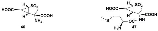 Further studies on some synthetic derivatives of kainic acid and analogs (Figure 3) are aimed, first, at discovering the earlier unknown events in the brain depending on kainate receptors. Second, analogous compounds can be used to create novel drugs. Some of these compounds have reached clinical trials. For example, the compound LY404039 (46) is a selective agonist for the metabotropic glutamate 2/3 (MGlu2/3) receptor. This preparation, when dosed as prodrug (47) (LY2140023), showed efficacy in schizophrenia. A series of similar compounds was studied as potential psychiatric medicines by such pharmaceutical companies as Lilly and Taisho [36].