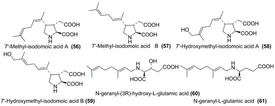 Several compounds related to domoic acid (dainic acids) have recently been described and named as 7′-methyl-isodomoic acid A (56), 7′-methyl-isodomoic acid B (57), 7′-hydroxymethyl-isodomoic A (58), and 7′-hydroxymethyl-isodomoic acid B (59). Closely related minor metabolites 60, 61, which do not contain pyrrolidine ring, have also been isolated from the same alga C. armata (Figure 4) [43].