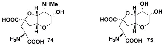 Structures of dysiherbaine (74) and neodysiherbaine (75).