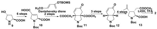 Poison et al. [20] elaborated an efficient synthesis of (–)-kainic acid (2) using just two of the above-mentioned approaches: application of a pyrrolidine precursor and cycloaddition. A high-pressure Diels-Alder cycloaddition of the obtained from 4-hydroxy-l-prolin (9) 3,4-unsaturated pyrrolidine derivative 10 with Danishefsky’s diene at high pressure (15 kbar) and room temperature gave bicyclic product 11. In this case, high pressure provided the gain in reactivity and led, after some additional treatment and 82 h of exposure, to a 96% conversion into 11 that contained N-protected trisubstituted pyrrolidine cycle. The subsequent decarboxylation and transformation of its six-membered ring to isopropenyl and carboxymethyl groups gave 12 converted into target product via pyrrolidine derivative 13 with almost total stereocontrol and an approximately 10% yield (Scheme 1). At the same time, the key intermediate product, enone 11, and related compounds were partly racemic in their first synthesis attempts. However, preliminary purification of the initial Danishevsky’s diene by rapid distillation and removal of trace triethylamine from it made it possible to synthesize 11 with excellent yield and high enantiomeric excess.