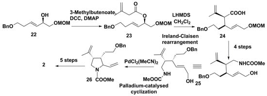 A similar strategy, also based on Ireland-Claisen rearrangement, was proposed by Japanese scientists as a unified approach to synthesize not only kainic acid proper, but also bioactive 4-substituted kainoids [22]. A source compound 22 was obtained from l-tartaric acid through four steps. Condensation of 22 with 3-methyl-3-butenoic acid gave ester 23 which, through the Claisen-Ireland rearrangement with LHMDS in the presence of TMSCl, was converted with high diastereoselectivity into carbonic acid 24. The subsequent reduction of a carboxy group and other transformations gave aminomethyl derivative 25. The resulting product was cyclized exceptionally easily through the palladium-mediated pyrrolidine-ring formation into the product 26 that had the required stereochemistry for transformation into kainic acid or its derivatives. After protection of the isopropenyl group, the corresponding conversion into 2 was achieved by oxidative cleavage of the vinyl group by ozonolysis followed by the Jones oxidation (Scheme 3).