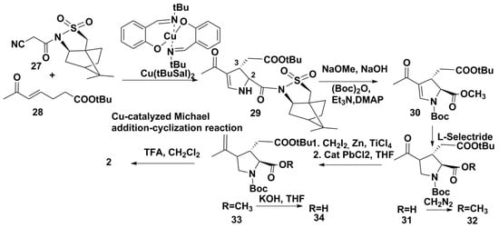 The advantage of the recent synthesis of kainic acid, developed by Japanese scientists [23], unlike most other multi-stage syntheses, consisted in only nine stages. This short total synthesis was carried out on the basis of the Cu-catalyzed Michael addition-cyclization reaction between the bearing chiral auxiliary of camphorsultam-type isonitrile 27 and ester of unsaturated ketoacid 28 (in mixture with an isomeric ester) with Cu(t-ButSal)2 as catalyst (Scheme 4). The additional ester was isomerized into 28 in the conditions of this reaction. The treatment of the obtained adduct 29 by sodium methoxide with the loss of chiral substituent, followed by protection with (Boc)2O in the presence of triethylamine and DMAP, gave unsaturated pyrrolidine 30. The alkaline hydrolysis of the amide group at the position 2 and the selective reduction of a double bond by boron-organic reagent l-selectride led to the protected analog of kainic acid 31 which was converted into the target compound via intermediates 32–34. This synthesis was carried out with a 16.8% overall yield on chiral isonitrile and was conducted on a 300 mg scale, although usually syntheses of 2 had given smaller amounts of this product.