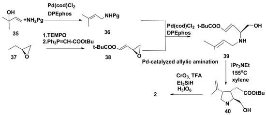A gram-scale synthesis of (–)-kainic acid through six steps and with a 34% overall yield was elaborated using the Pt-catalyzed direct allylic amination [24]. This amination was catalyzed by the combination of dichloro(1,5-cyclooctadiene) platinum (Pt(cod)Cl2) with bis[2-di-phenylphosphino) ether (PPEphos). Such new approach allows catalyzing the direct introduction of amino group into allylic alcohols. The chosen scheme provided the minimum number of stages in this synthesis (Scheme 5). Amination of 35 under microwave heating conditions gave monoallylamine 36. As a protective group (Pg), authors preferred to use 2,4-dimethoxybenzyl (DMB) or p-methoxybenzyl (PMB) with almost no loss of enantiopurity. The unsaturated ester 38 was obtained by one-pot oxidation of epoxide 37 with 2,2,6,6-tetramethyl-1-piperidinyloxy (TEMPO) followed by the Wittig reaction. It was found that the transformation of 36 and 38 into diallylamine derivative 39 at a higher concentration inhibited the epimerization, and the desired product was obtained in 95% yield and 98% ee (enantiomeric excess). The following stage of heating in a sealed tube with xylenes and a catalytic amount of iPr2N-Et gave pyrrolidine 40 in 75% yield and 14:1 diastereoselectivity. The Jones oxidation with application of H5IO6 as terminal oxidant gave satisfactory results at conversion of 40 into 2 (Scheme 5). Finally, 1.11 g pure kainic acid was obtained by this method in 34% overall yield. Taking into account its yield and the minimal number of steps, this proved to be the best chemical scheme elaborated to synthesize 2.