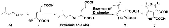 Recently, Moore’s team from the USA studied the biosynthesis of two related excitatory amino acids: domoic acid from diatoms and kainic acid from red macrophytes. After elucidating the origin of kainic acid 2, they performed the whole genome sequencing of a kainic acid producer, Digenea simplex, to identify the gene clusters involved in the biosynthesis of 2 [27]. They used the new single-molecule, long-read sequencing platforms such as Oxford Nanopore Technologies. As a result, the long reads that included genes encoding the kainic acid biosynthesis were sequenced; however, due to the presence of impurity of microbial DNA, they were not assembled into the whole genome of this alga. After the analysis of D. simpex on a higher-throughput platform, Prometh ION, 47 Gp of sequence was generated, with the longest read being 1.2 Mb. A series of Digenea simplex kainic acid biosynthesis (Dskab) genes were uncovered. They included genes of annotated N-prenyltransferase (DsKabA), α-ketoglutarate-dependent dioxygenase (DskabC), and several retrotransposable elements such as integrase, reverse transcriptases, and RNA H domains. Both sequences, DsKabA and DskabC, were successfully expressed in Echerichia coli and purified. Incubation of recombinant DskabA with l-glutamate 1 and dimethylallylpyrophosphate 44 gave N-dimethylallyl-l-glutamic acid 45 (the so-called prekainic acid). This compound was converted into kainic acid in an aqueous extract from D. simplex. Another enzyme of kainic acid biosynthesis, the so-called DsKabC, was incubated with prekainic acid, α-keto-glutarate, l-ascorbate, and Fe2+, and transformed prekainic acid into kainic acid (2) and kainic acid lactone (7) (Scheme 7). The main product was confirmed to be kainic acid using isolation from the culture medium and NMR elucidation. The obtained kainic acid lactone 7 has been shown to be antagonist of iGluR in contrast to kainic acid proper.