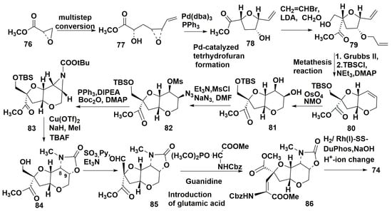 Gilbeston and co-authors [75] from the University of Houston, USA, proposed a new variant of enantioselective synthesis of 74 which differed in a later design of functionalities in the tetrahydropyran ring than in other known pathways. The scheme of this synthesis suggested, first, the creation of tetrahydrofuran derivative and then the formation of tetrahydropyran ring with the use of metathesis reaction. The following introduction of the necessary substituents and, finally, the attachment of glutamic acid moiety to the furan fragment completed the synthesis. The furan fragment of 74 was constructed from methylglycidate 76. This compound was transformed by a series of reactions into α,β-unsaturated epoxide 77. The palladium catalyzed opening of this epoxide yielded the furan derivative 78. Then 78 was converted by allylation of free alcohol with allyl bromide and silver oxide to provide the diene metathesis substrate 79, in which oxymethyl group was introduced by reaction with LDA and formaldehyde. The derivative 79 was obtained as a mixture of stereoisomers and one of them, suitable for further transformations, was isolated by column chromatography. Metathesis of 79 with protection of hydroxy group gave 80, containing the bicyclic core system of dysiherbaine. The oxidation of the double bond in 80 with OSO4 and N-oxide of methylmorpholine (MMO) led to diol 81. On the following stages of introduction of mesyl and azide groups in the pyrane cycle was carried out to obtain 82. The treatment of 82 with PPh3 and N,N-diisopropylethylamine (DIPEA) successfully provided aziridine 83, protected with Boc. The consequent reaction with copper (II) triflate, methylation, and deprotection of oxymethyl group provided the rearranged production of 84. Further steps were the transformation into aldehyde 85, introduction of glutamic acid residue to obtain 86. Asymmetric hydrogenation with rhodium DuPhos (DuPhos is a class of organophosphorus compounds that are used as ligands for asymmetric syntheses), followed by deprotection of amino group and alkaline hydrolysis gave the target compound 74 (Scheme 10).