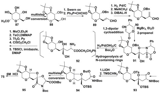 A total synthesis of neodysiherbaine A (75) based on 1,3-dipolar cycloaddition of a chiral nitrone to sugar-derived product, containing tetrahydropyran moiety, has also been reported recently [76]. The pyran allylic alcohol was obtained from methyl-α-D-mannopyranoside (87) through conversion into derivative 88 by the previously known multistep procedure, and, after the Swern oxidation and Wittig reaction, gave 89. The further hydrogenation and Mannich reaction with Eschenmoser’s salt yielded aldehyde, which, after DIBAL-H reduction, gave the compound 90. The bipolar addition of a nitrone, catalyzed by etherate of MgBr2, led to 91. This cycloaddition constructed the C2 and C4 asymmetric centers in a single step. Further transformations resulting in reductive cleavage of O-benzyl, N−O, and N-benzyl bond, which occurred simultaneously, led to intermediate 92 which was converted by multistep transformations into another key product (93). The intramolecular SN2 reaction in 93 led to the compound 94 containing the required configurations of all six stereogenic centers of neodysiherbaine A. The multistep substitution and removal of protective groups and formation of tricyclic intermediate 95, followed by hydrolysis with 6M HCl, completed this synthesis (Scheme 11).
