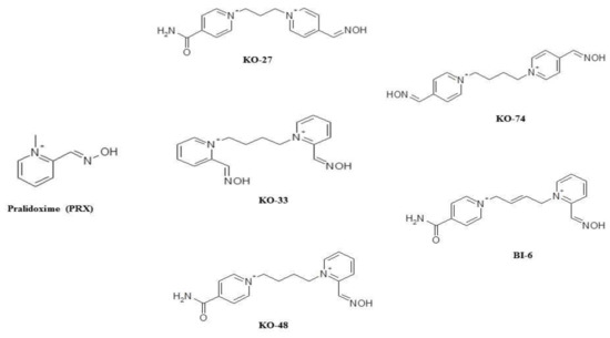 Chemical structure of pralidoxime (PRX) and new bisquaternary symmetric (KO-33, KO-74) or asymmetric pyridinium (KO-27, KO-48, BI-6) aldoximes.