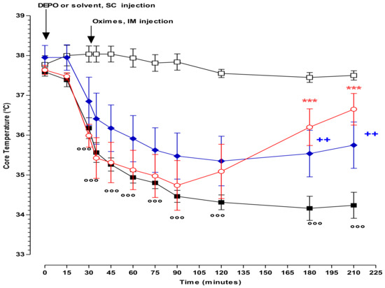 Effects of solvent (white square), diethyl-paraoxon (DEPO, black square), diethyl-paraoxon + pralidoxime (DEPO+PRX, blue diamond), and diethyl-paraoxon + BI-6 (DEPO+BI-6, open red circle) on core temperature. Arrows mark the injection time of solvent or DEPO and PRX or BI-6. Each group consisted of eight rats. Data are represented by mean ± S.E.M. at each time after injection. DEPO vs. Control: °°° p < 0.01; DEPO+BI-6 vs. PRX: ++ p < 0.001; DEPO+BI-6 vs. DEPO: *** p < 0.001.