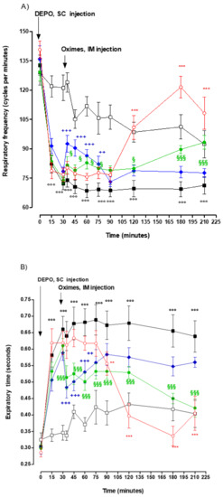 In the first study, we addressed whether the administration of oximes alone had any effects on the ventilation at rest. Accordingly, the effects of these treatments in rats were compared to the effects of the solvent (sodium isotonic solution) administered to animals using a two-way analysis of variance for repeated measurements. For each parameter, when a significant time*treatment interaction was found, this analysis was followed by multiple pair-wise comparisons.