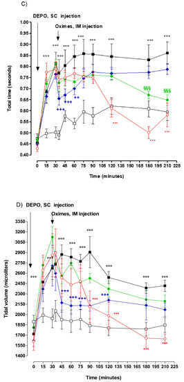 In conclusion, the plethysmography method allowed comparing the efficacy of different oximes on toxic non-lethal diethyl-paraoxon-induced ventilatory effects in rats. Using this model, we showed that oximes, including KO-27 and BI-6, developed by Kuca’s team were more potent than PRX to counteract the respiratory effects at rest of DEPO. KO-27 is particularly interesting because of its long-time effect, at least 130 min after intra-muscular administration. At the opposite, BI-6 showed a long-lasting effect and became efficient when the antidotal effect of PRX disappeared. The present results suggest that a combination of PRX and BI-6 therapy should be considered to treat human organophosphate poisoning. The association may even be expected to result in a sparing effect of atropine in reversal over OP toxicity in addition to protect individuals expected to be exposed to nerve agents.