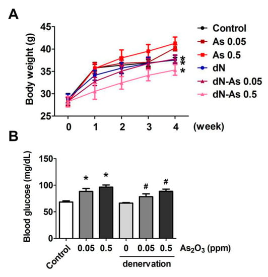 Effects of As2O3 on the body weight and blood glucose in mice with or without denervation. As2O3 (0.05 and 0.5 ppm) exposure from drinking water for 4 weeks in normal mice or denervated mice. (A). The changes in body weights were shown. (B). The blood glucose levels in mice were shown. Data are presented as the mean ± SEM (n = 6 of each group). * P < 0.05 compared to the control group; # P < 0.05 compared to the denervation group.